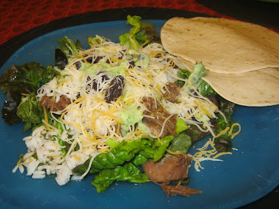 Place tortilla on plate. Top with rice, beans, pork, salad, cheese then dressing